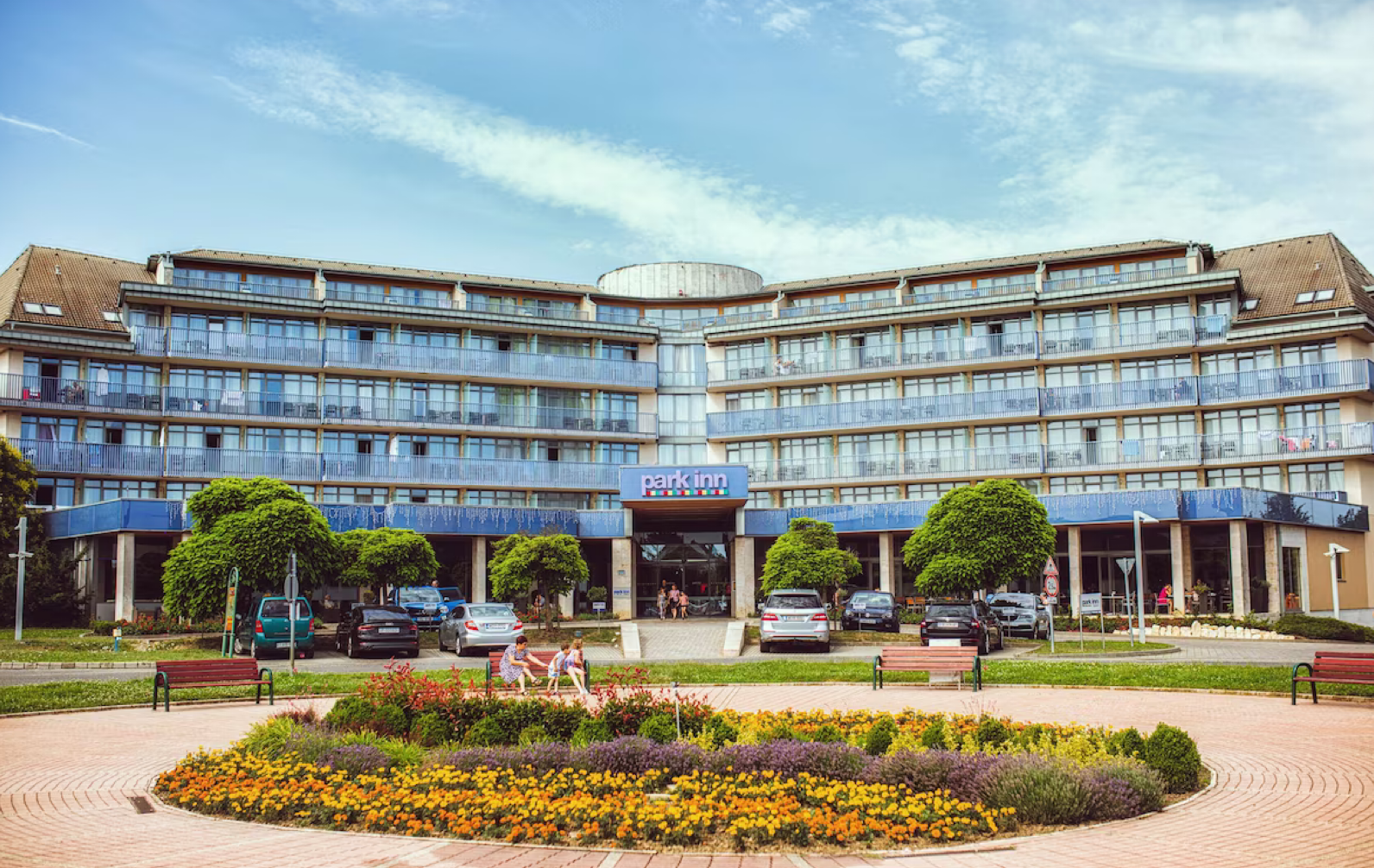 Moderní hotel Park Inn je umístěn v těsné blízkosti termálních lázní a wellness i léčebného centra, s nimiž je propojen krytou chodbou. Centrum města s historickými pamětihodnostmi je vzdáleno přibližně 15 minut volné pěší chůze. Objekt je obzvláště vhodný pro wellness, lázeňské, relaxační a léčebné pobyty, ale také pro kongresovou turistiku. Hotelové služby: Restaurace a bar La Caraffa s venkovní terasou nabízí bohaté bufetové snídaně, večeře formou bufetu se širokým výběrem národních a mezinárodních jídel. Graffiti bar nabízí lehká jídla a dezerty, osvěžující studené a teplé nápoje. Recepce 24 hodin, výtah, dětský koutek, kulečník, stolní fotbal a šipky, kongresová místnost pro 300 osob předělitelná na tři separátní místnosti, 4 další místnosti vhodné pro školení. Směnárna CZK na HUF bez poplatků, vlastní parkoviště a podzemní garáže za poplatek – platí se na místě. Hosté mají neomezený vstup do lázní (vnitřní a venkovní bazény s termální léčivou vodou, vnitřní a venkovní zážitkové bazény, venkovní plavecký bazén, „Svět sauny“ v antickém stylu (finské sauny, bio sauna, soft sauna, parní lázně, aroma terapeutické kabinky, Kneipova lázeň a masáž nohou, sluneční terasa). Fitness v sektoru lázní s profesionální asistencí, malá tělocvična, aerobic, step aerobic, dětský aerobic, kick-box, fit ball, formování postavy, gymnastika zaměřená na páteř, dechové techniky, stretching atd., v dosahu možnost využití tenisových kurtů. Kosmetika, kadeřnictví, manikúra a pedikúra, solárium.