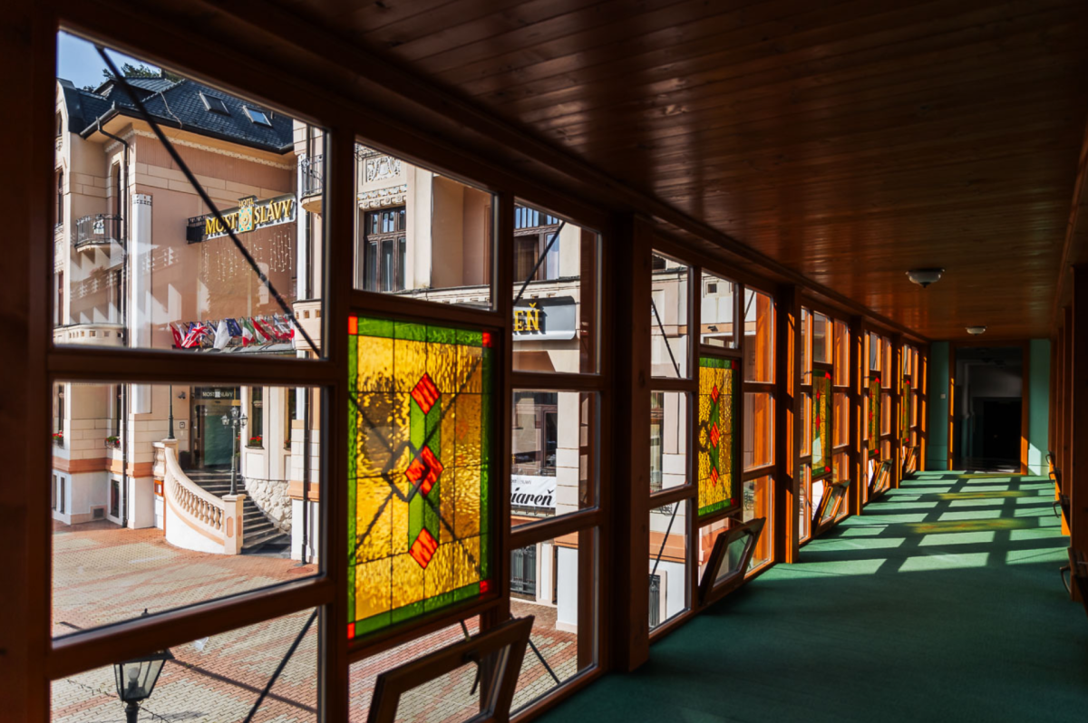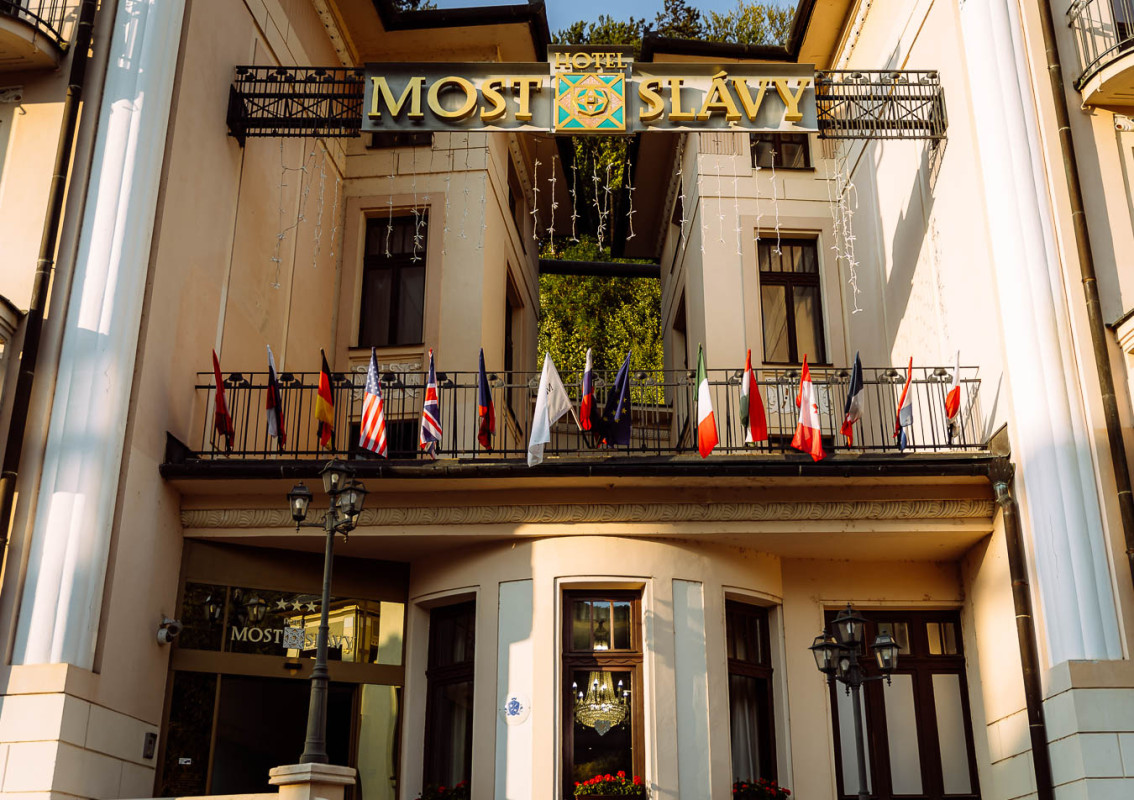 Hotel Most Slávy sídlí v krásné historické budově s výjimečnou dobovou atmosféru. Nachází v centru města, na okraji lázeňského parku, v těsné blízkosti řeky Teplička. Hotel je spojený s mezinárodním filmovým festivalem ART Film.Před vchodem do hotelu se nachází známý Most slávy, se jmény významných osobností oceněných na MFF ARTFILM.