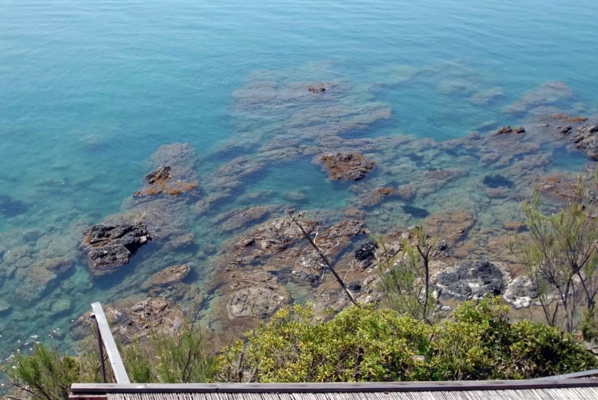 u pláže, přístup po schodech (popř. lze využít výtah). písečná ve formě zátoky, ohraničená útesem, plážový servis lze zakoupit na místě.