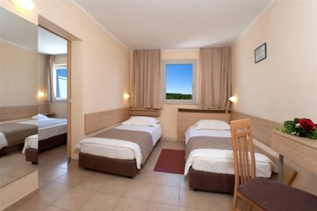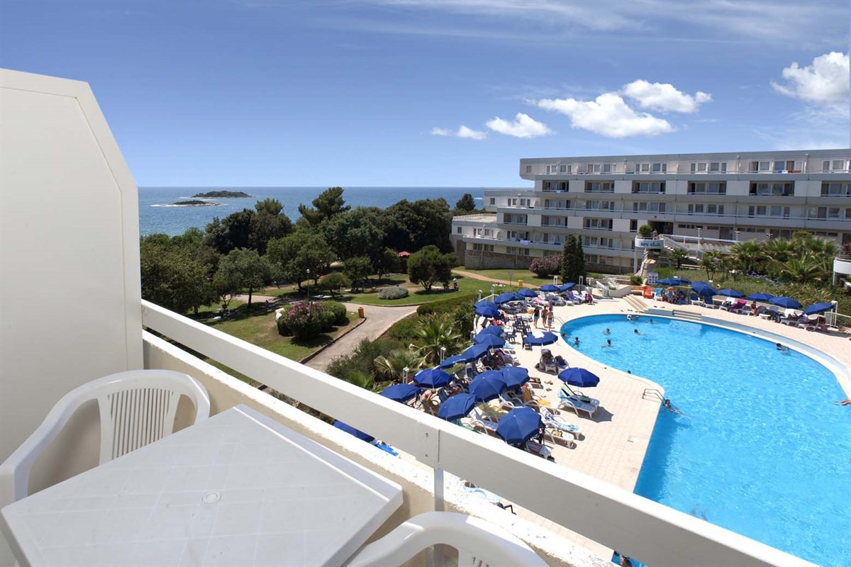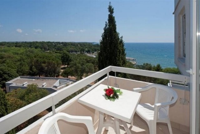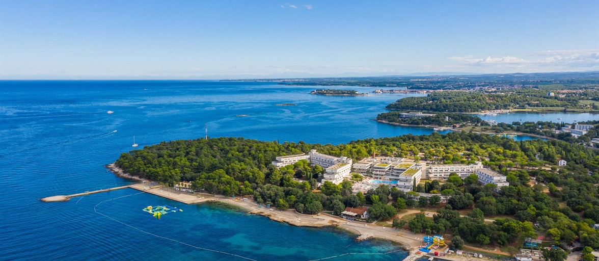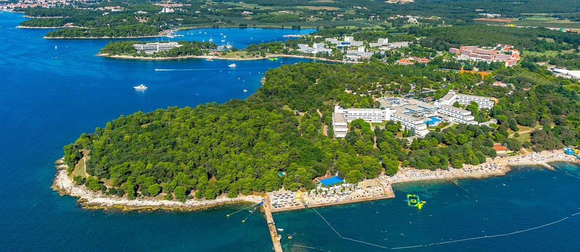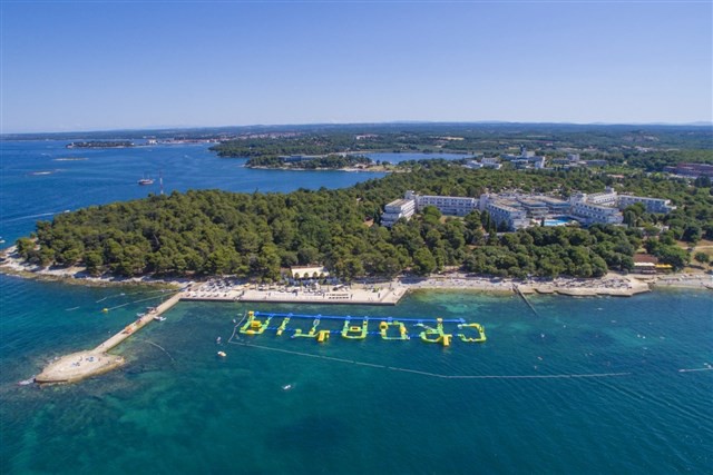 Hotel Delfín se nachází na slunečném poloostrově, z hotelů ve středisku Zelena Laguna nejblíže k otevřenému moři. Jedná se o malé samostatné městečko, neboť má 793 pokojů, tj. cca 1600 lůžek.
