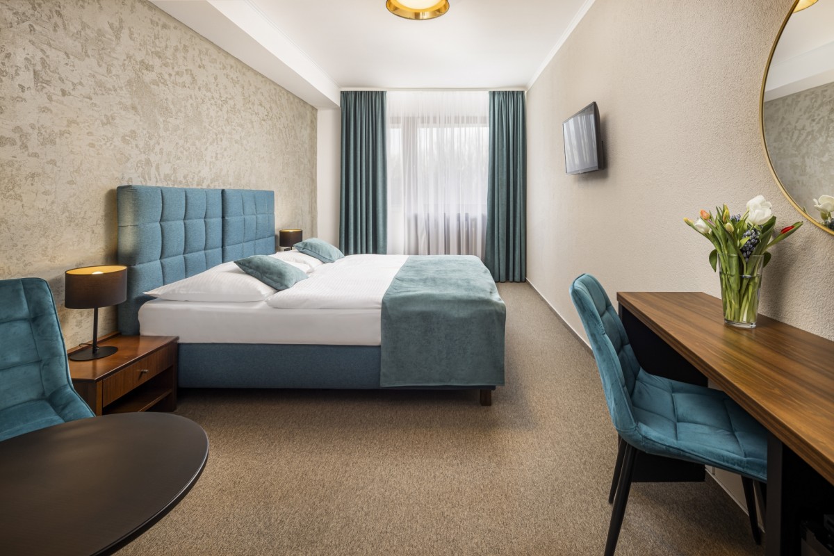 moderně zařízené 2-lůžkové pokoje a apartmány. Všechny jsou vybaveny sprchovým koutem nebo vanou, toaletou, TV SAT, telefonem, balkonem, županem.