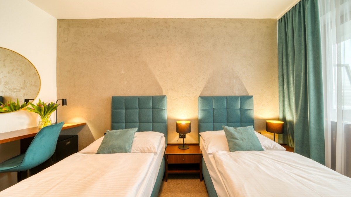 moderně zařízené 2-lůžkové pokoje a apartmány. Všechny jsou vybaveny sprchovým koutem nebo vanou, toaletou, TV SAT, telefonem, balkonem, županem.