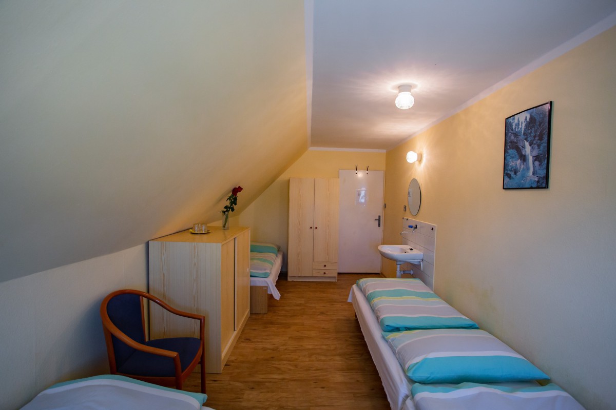 • Třílůžkový pokoj č. 7 – Pokoj ve druhém patře s vlastním sociálním zařízením na pokoji. Na pokoji jsou 3 jednolůžkové postele.