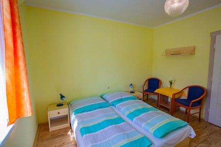 • Dvoulůžkový pokoj pokoj č. 5 – Pokoj s oddělenými posteli. Pokoj v druhém patře s vlastním sociálním zařízením. Sociální zařízení pro tento pokoj je přes chodbu.