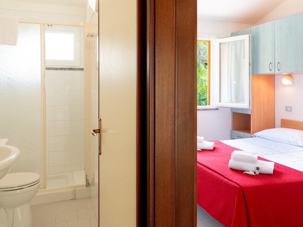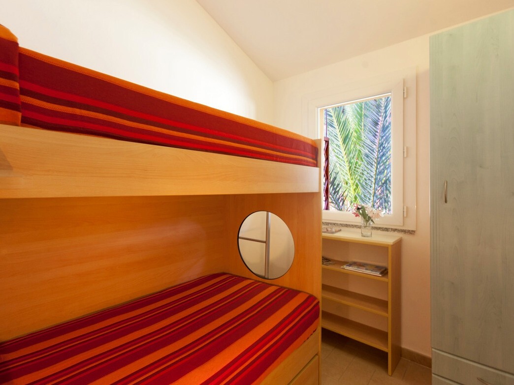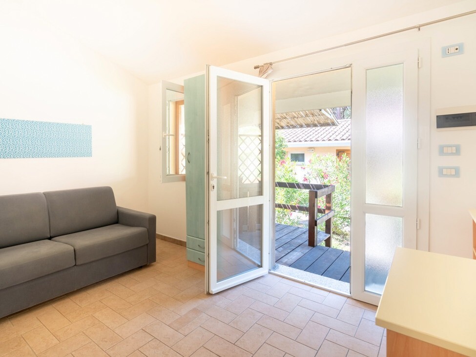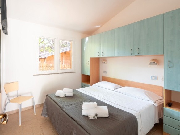 Bungalov pro 2-4 osoby: pokoj s manželskou postelí, obývací pokoj s rozkládacím gaučem nebo patrovou postelí a kuchyňským koutem, terasa nebo zahrádka, klimatizace, TV/SAT