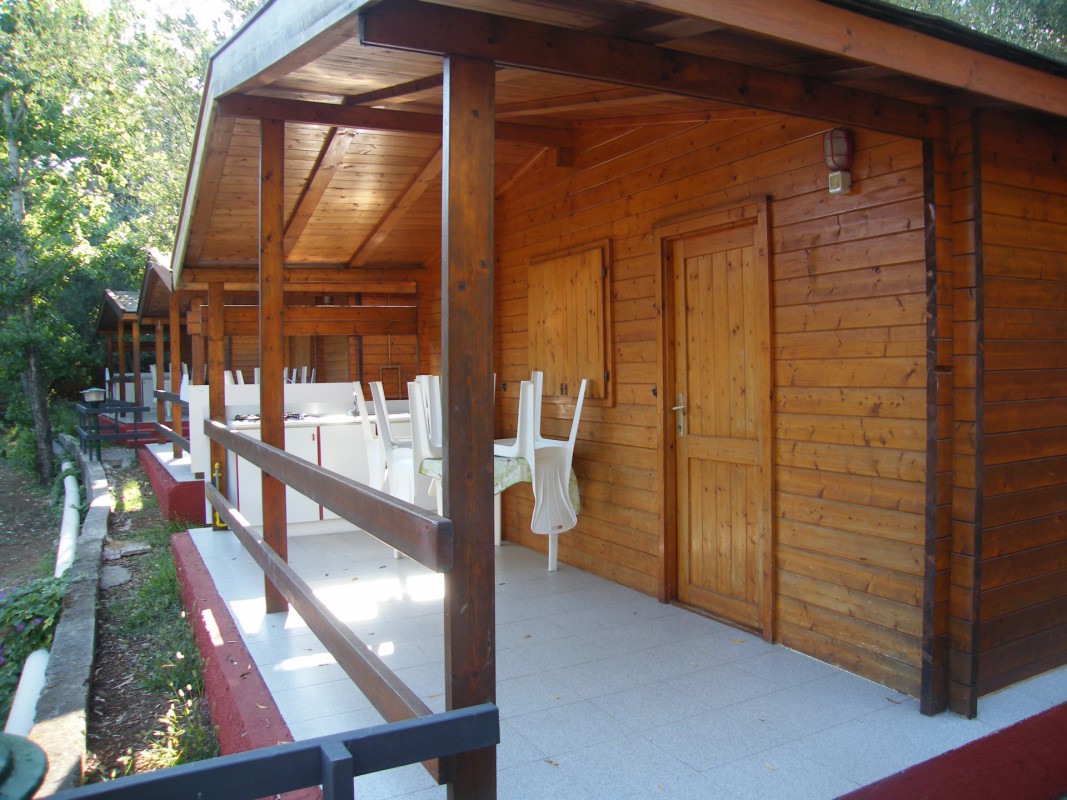 dřevěný bungalov pro 4 osoby - pokoj s manželskou postelí, pokoj se 2 lůžky, sociální zařízení, kuchyňský kout na kryté terase, ventilátor v obou pokojích