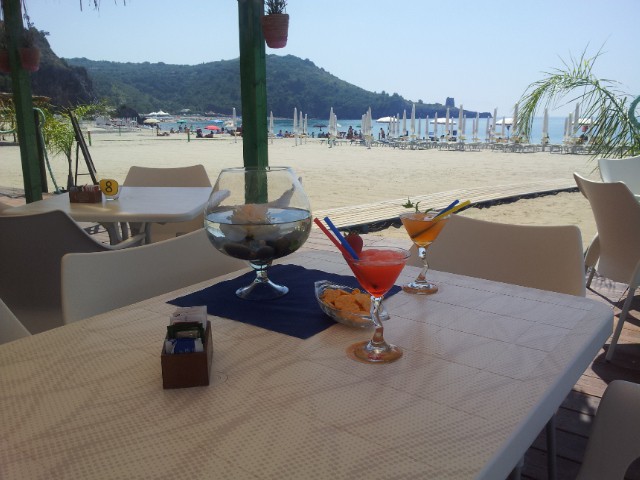 privátní písečná pláž s pozvolným vstupem do moře, cca100 -150m, je dostupná po krátkém schodišti z areálu na pláž, okraje pláže lemovány skalnatými útesy, plážový servis (1 slunečník + 2 křesílka)